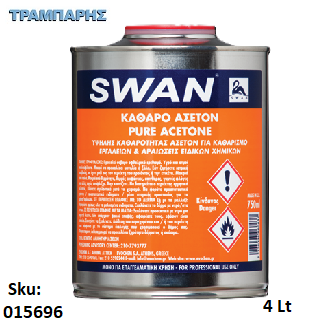 ΠΕΡΙΓΡΑΦΗΤο SWAN ΑΣΕΤΟΝ είναι οργανικός διαλύτης, παράγωγο του προπυλενίου.Χρησιμοποιείται κυρίως για καθαρισμό και απολίπανση επιφανειών καθώςκαι για αραίωση χρωμάτων και άλλων χημικών.ΕΦΑΡΜΟΓΕΣ• Καθαρισμός εξαρτημάτων και επιφανειών.• Αραίωση ειδικών χρωμάτων.• Διαλυτικό ειδικών συγκολλητικών ουσιών και κυανοακρυλικών (SUPERGLUE) πριν τη σκλήρυνση.• Κατάλληλο για απολίπανση βαριάς χρήσης για μέταλλα πριν τη βαφή.