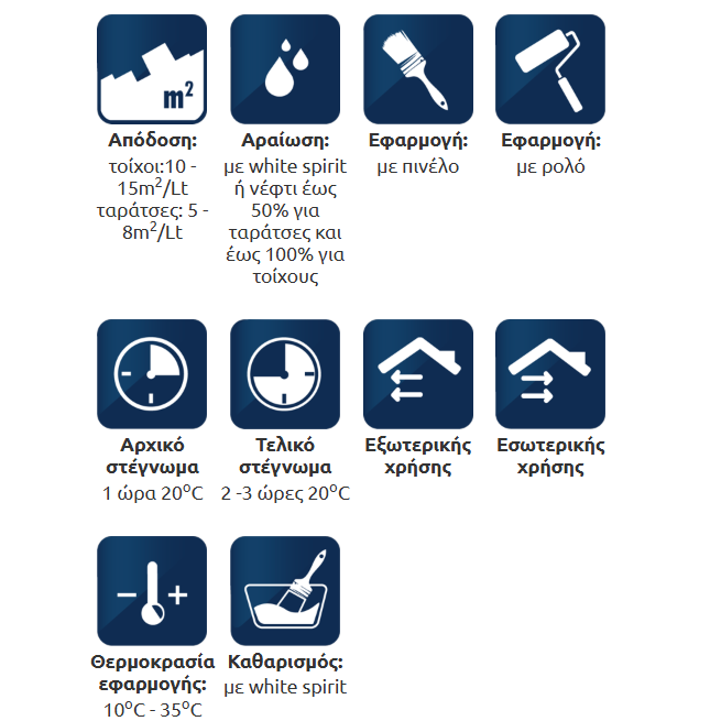 ΑΠΟΔΟΣΗ: Τοίχοι: 10 - 15m2/Lt Ταράτσες: 5 - 8m2/Lt