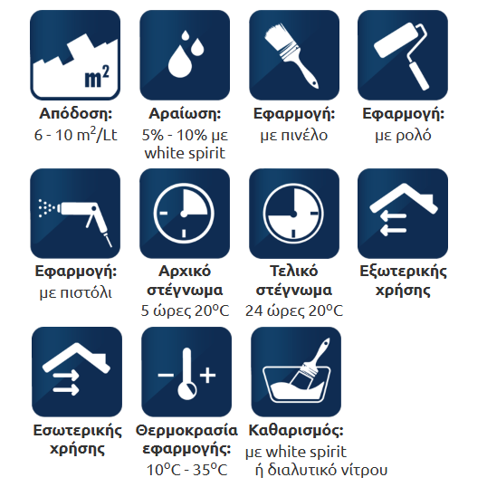 ΑΠΟΔΟΣΗ: 10 - 12 m2/Lt ανά στρώση, ανάλογα με την απορροφητικότητα του