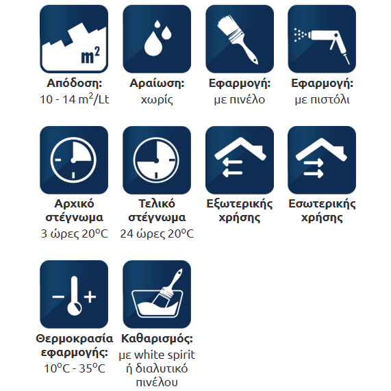 Χρόνος στεγνώματος: στην αφή 2-4 ώρες ανάλογα με τις συνθήκες περιβάλλοντος. Περιμένετε τουλάχιστον 24 ώρες πριν από βαριά χρήση των επιφανειών. Μην περπατάτε πάνω στο ξύλινο κατάστρωμα πριν στεγνώσει.