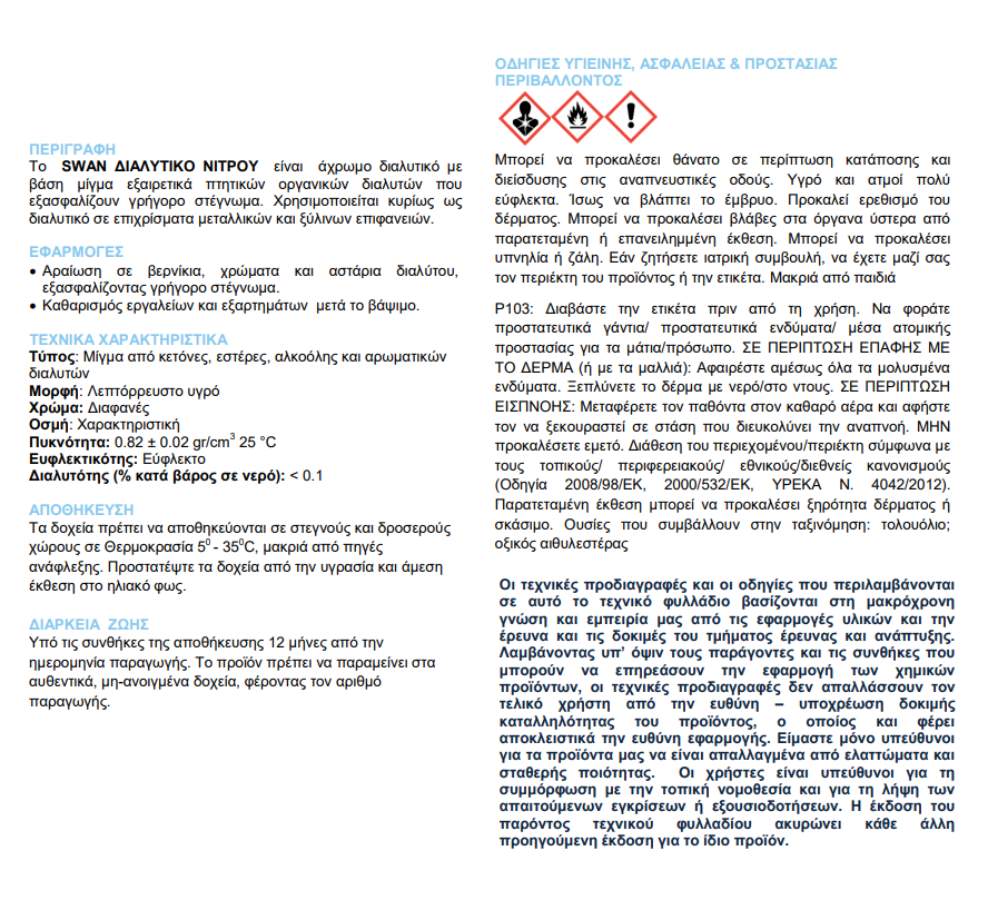 ΠΕΡΙΓΡΑΦΗΤο SWAN ΔΙΑΛΥΤΙΚΟ ΝΙΤΡΟΥ είναι άχρωμο διαλυτικό με βάση μίγμαεξαιρετικά πτητικών οργανικών διαλυτών που εξασφαλίζουν γρήγορο στέ-γνωμα. Χρησιμοποιείται κυρίως ως διαλυτικό σε επιχρίσματα μεταλλικώνκαι ξύλινων επιφανειών.ΕΦΑΡΜΟΓΕΣ• Αραίωση σε βερνίκια, χρώματα και αστάρια διαλύτου, εξασφαλίζονταςγρήγορο στέγνωμα.• Καθαρισμός εργαλείων και εξαρτημάτων μετά το βάψιμο.
