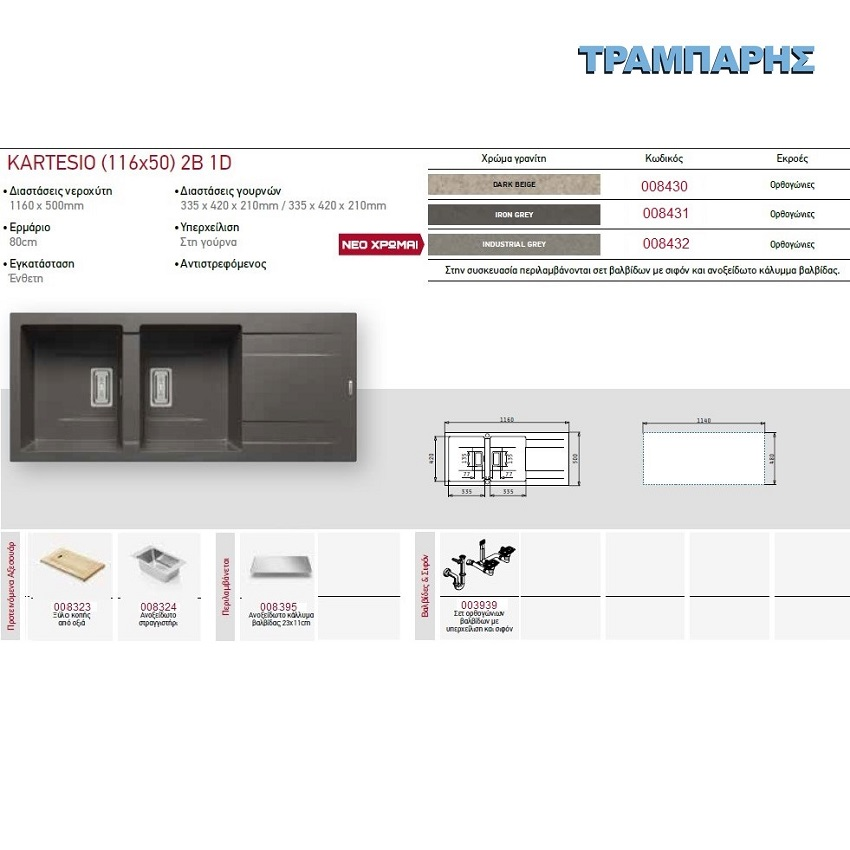 Νεροχύτης με 2 γούρνες, διαστάσεις: 116x50 cm, διαστάσεις γούρνας: 33,5x42x21 cm, Iron grey