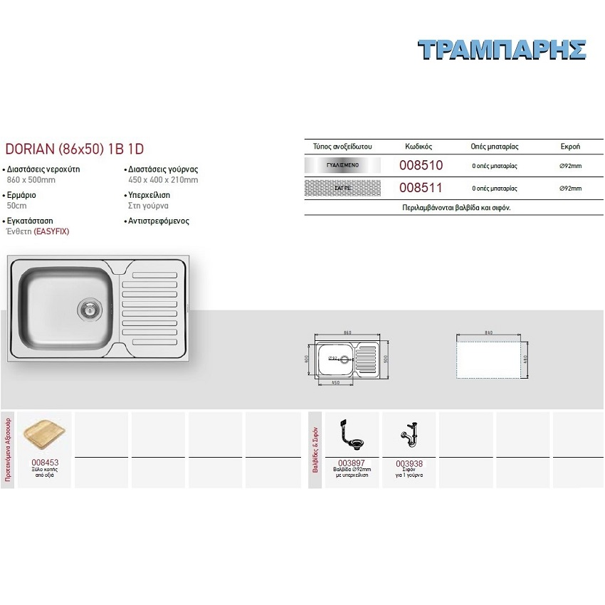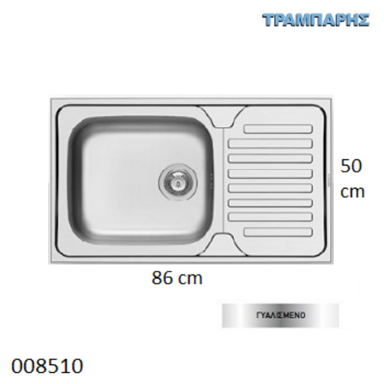 Νεροχύτης με 1 γούρνα, διαστάσεις: 86x50 cm, διαστάσεις γούρνας: 45x40x21 cm, Inox Γυαλισμένο