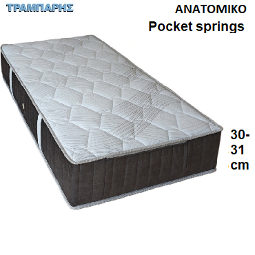 Στρώμα ανατομικό (pocket springs), Πάχος : 30-31 cm , Βαθμός σκληρότητας : Μαλακό. Αποτελείται απο ανεξάρτητα ελατήρια, αφρωδες υλικο 3 cm πυκνοτητας Νο 900, αφρωδες υλικό (memory Foam 3 cm), πολυεστερική βάτα, ύφασμα πλεκτό βαμβακερό και περιμετρηκή στήριξη. Στρώμα δύο όψεων....Συνιστάται αλλαγή πλευράς ανά 3μηνο.